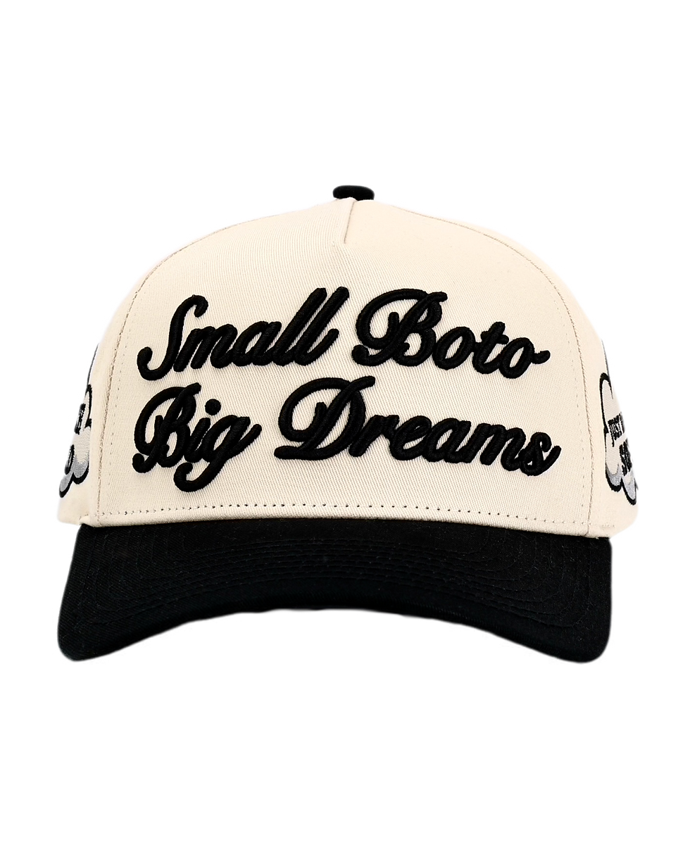 Available now! Ready to ship. Limited Collection. Get it now or never. Small Boto Big Dreams Cream Hat. Cotton. 1 INCH HARD, JUST BALLS SOFT. 5 panel.Small Boto Big Dreams Cream Hat$45.00PriceColor: CREAM*Quantity*Only 5 left in stockAdd To CartBuy Now